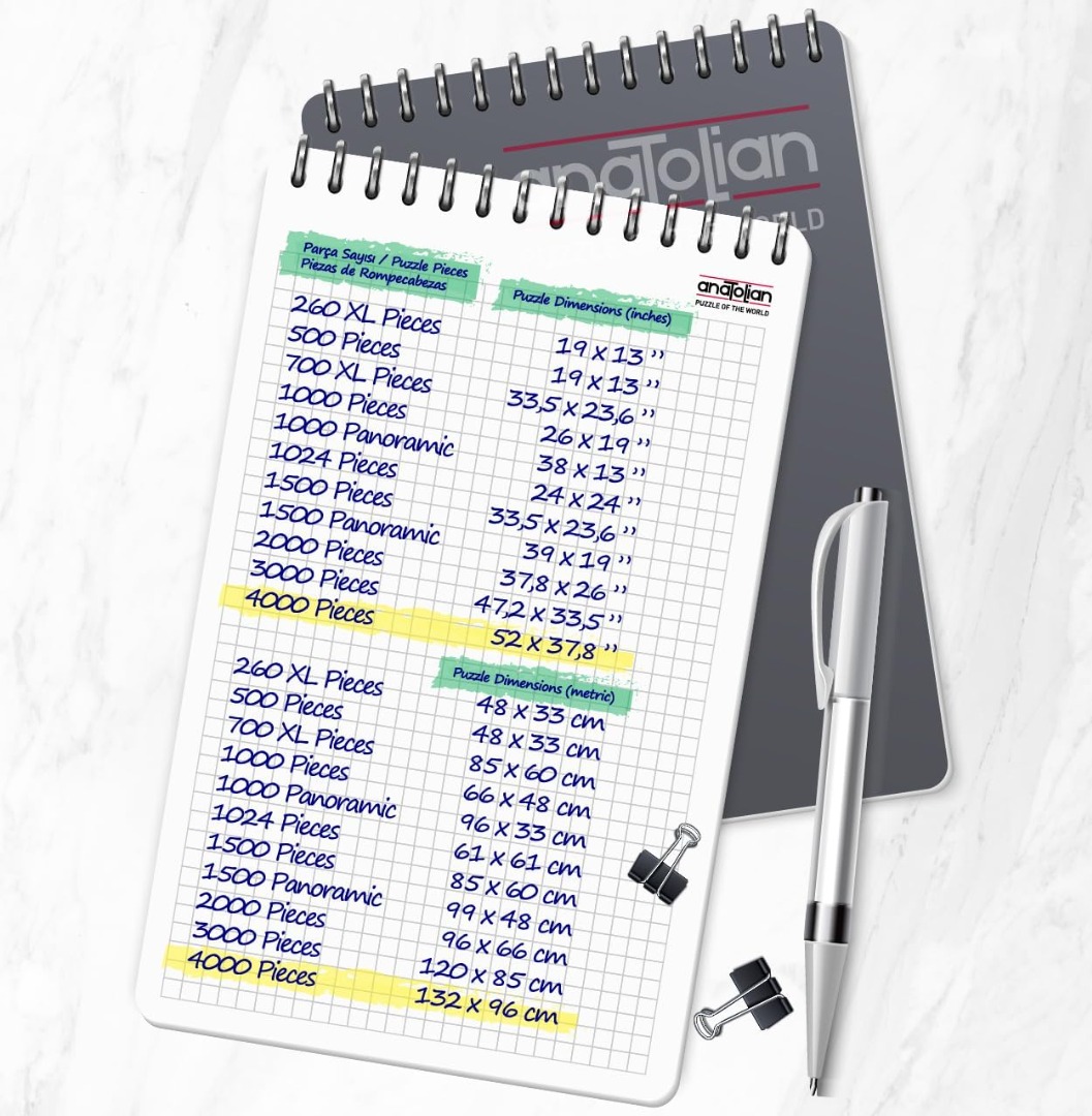 Anatolian is een Turks merk van uitstekende kwaliteit. De puzzelstukjes zijn stevig en hebben een goede dikte. De kleuren zijn warm en de afbeeldingen scherp. De puzzel wordt in rastervorm gelegd (net zoals Gibsons en Ravensburger) maar de puzzelstukjes zelf hebben zoveel variëteit dat het altijd duidelijk is of een stukje past of niet. Wordt geleverd met een standaard om de deksel in te zetten.