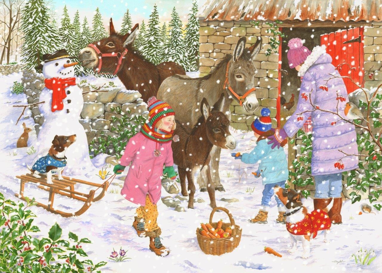 Ezels zijn dol op worteltjes! Er zijn er genoeg.......maar een ezeltje kan niet wachten en probeert de neus van de sneeuwpop op te eten!
