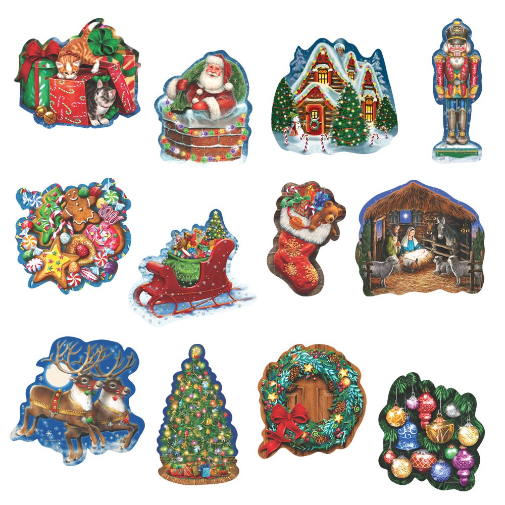 12 kleine puzzeltjes in verschillende vormen die allemaal met Kerst te maken hebben, in het totaal 750 Stukjes.