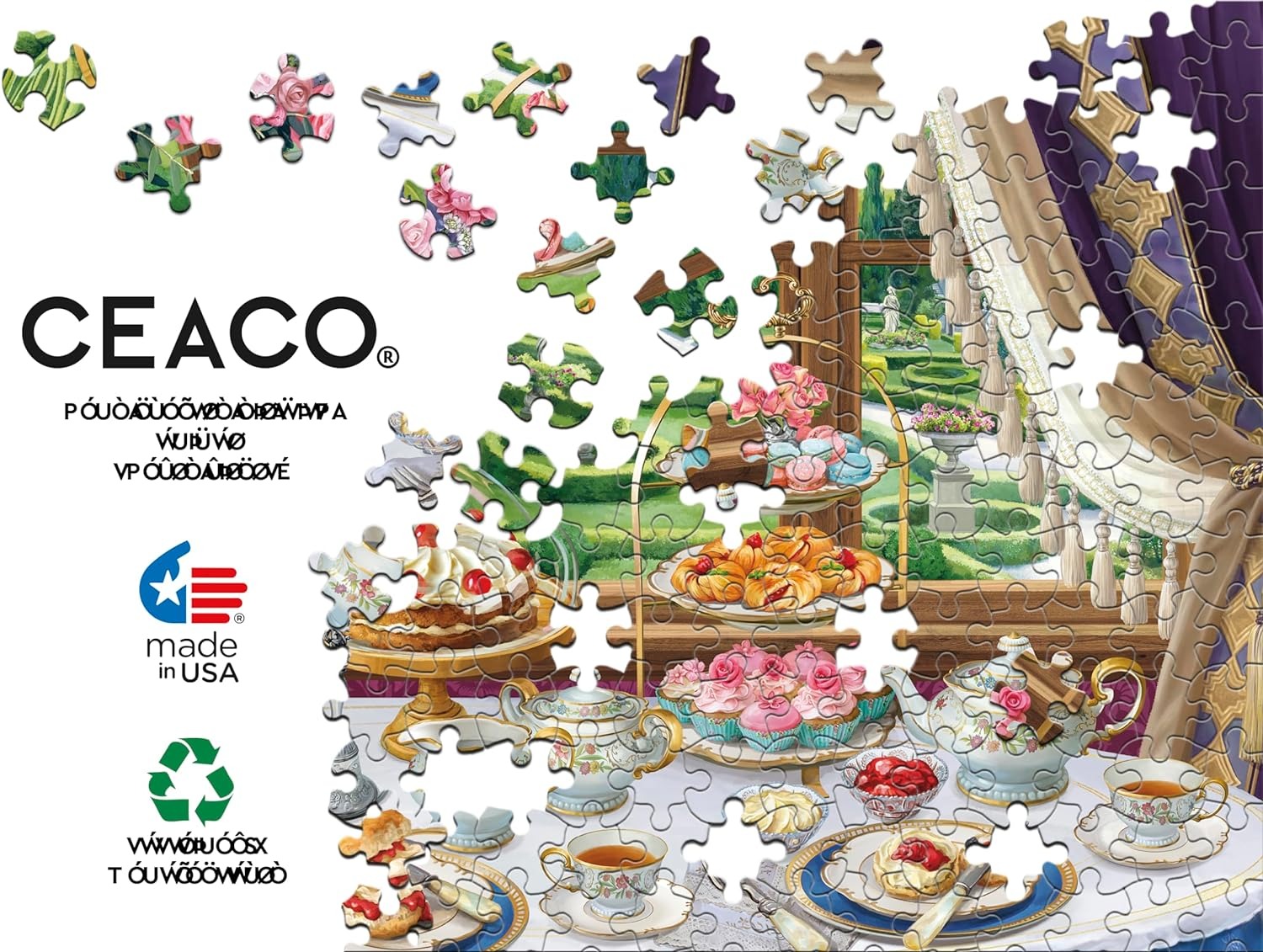 Ceaco is een Amerikaans puzzelmerk. De puzzelstukjes zijn wat dunner dan normaal en voelen ook lichter aan. Ze hebben een normale grootte. Wordt in rastervorm gelegd met heel veel variatie in de puzzelstukjes. De kleuren zijn warm.