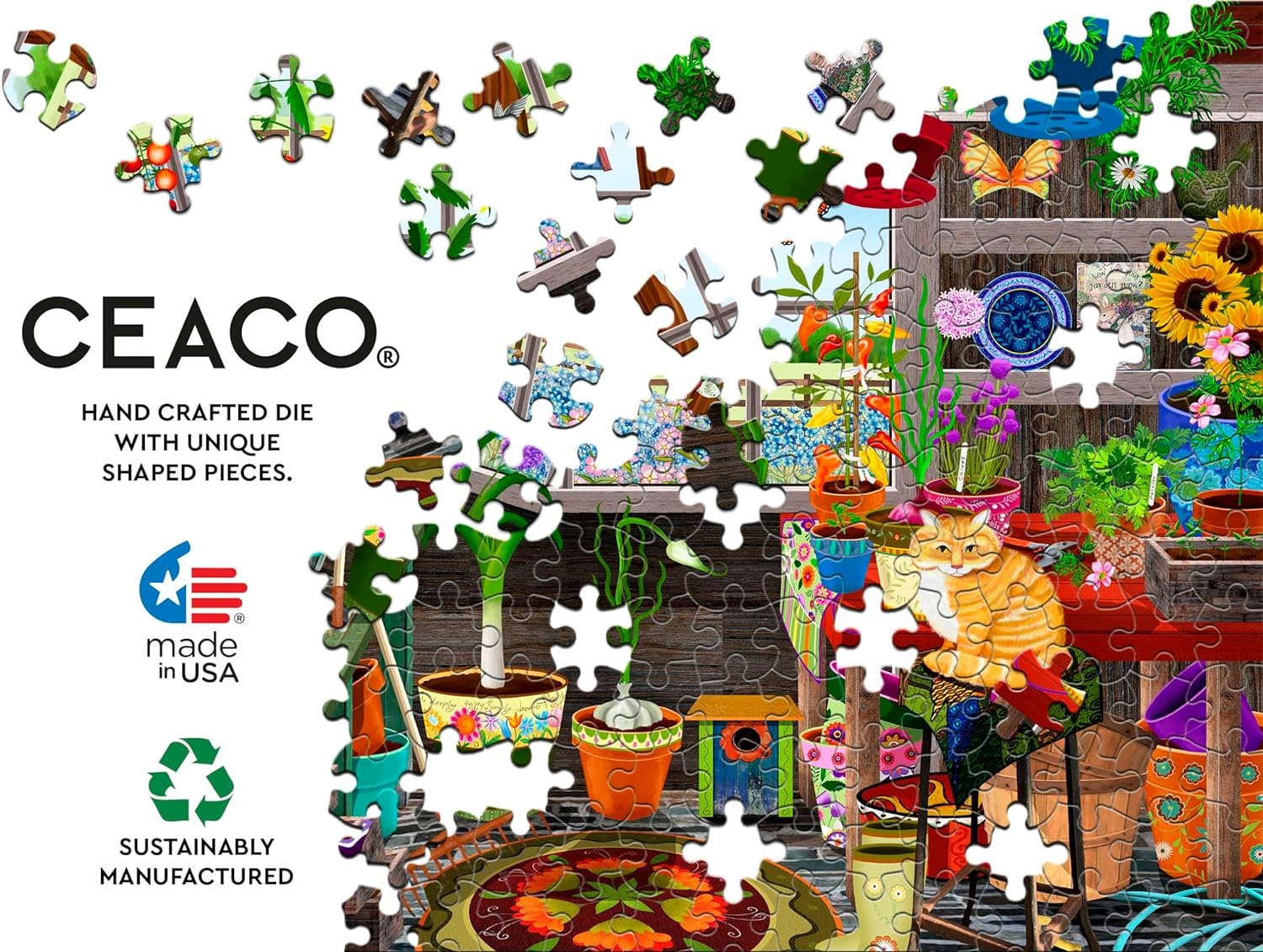 Ceaco is een Amerikaans puzzelmerk. De puzzelstukjes zijn wat dunner dan normaal en voelen ook lichter aan. Ze hebben een normale grootte. Wordt in rastervorm gelegd met heel veel variatie in de puzzelstukjes.