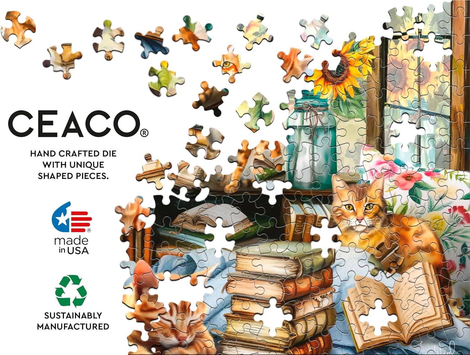 Ceaco is een Amerikaans puzzelmerk. De puzzelstukjes zijn wat dunner dan normaal en voelen ook lichter aan. Ze hebben een normale grootte. Wordt in rastervorm gelegd met heel veel variatie in de puzzelstukjes. De kleuren zijn warm.