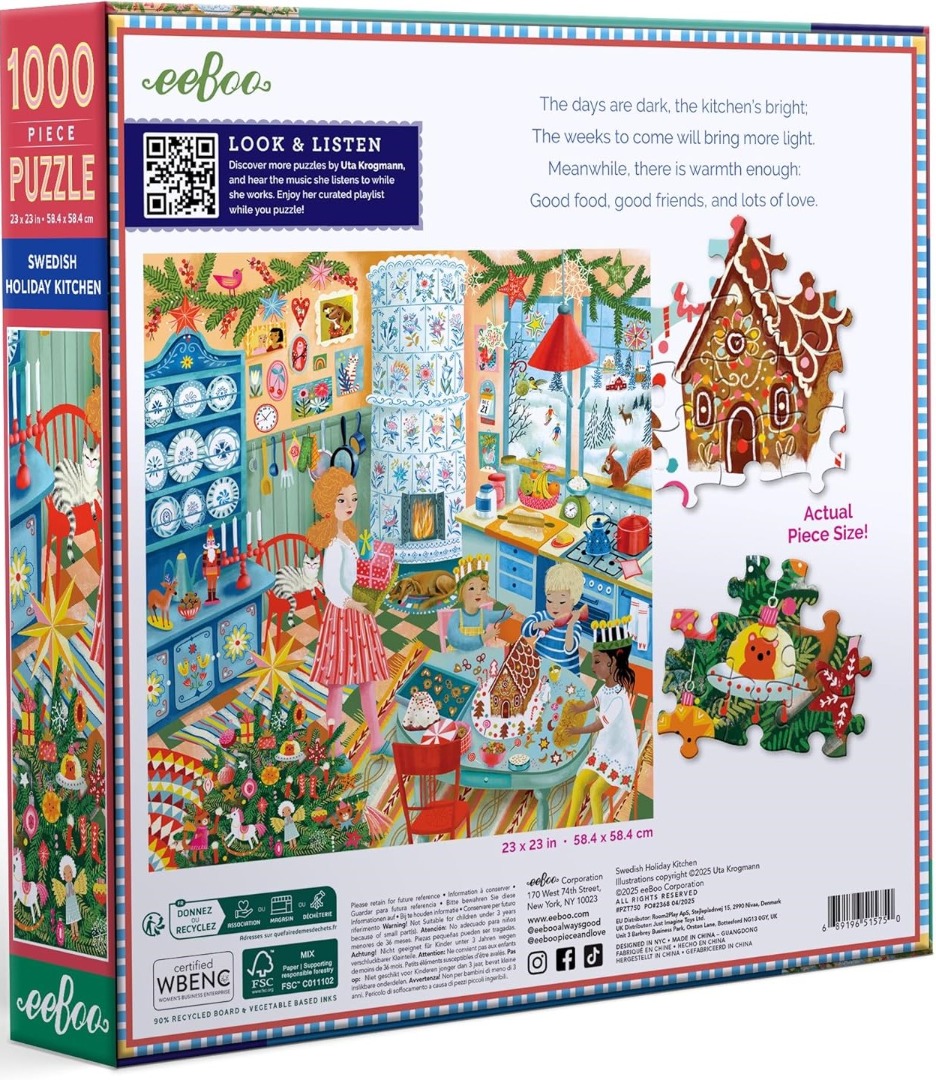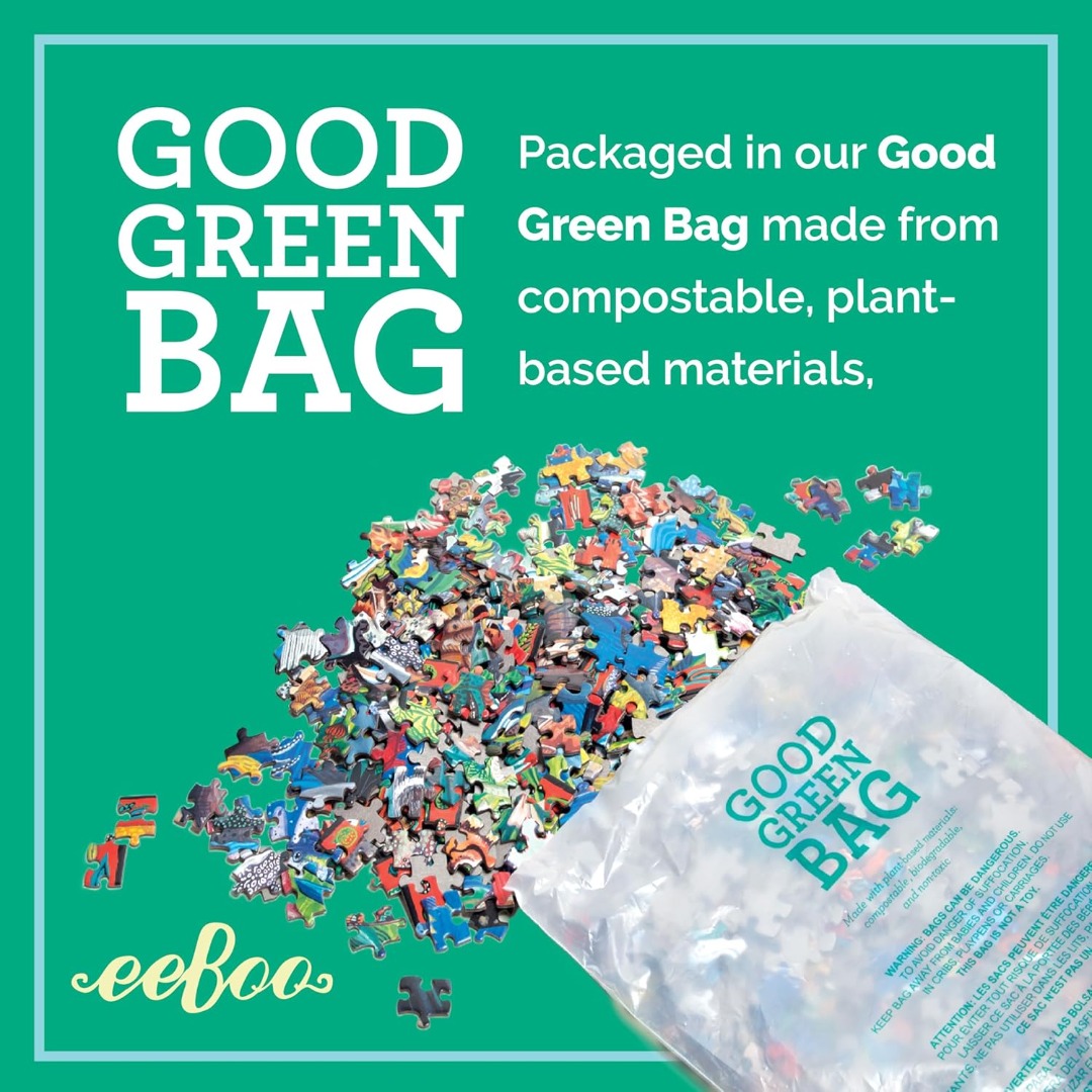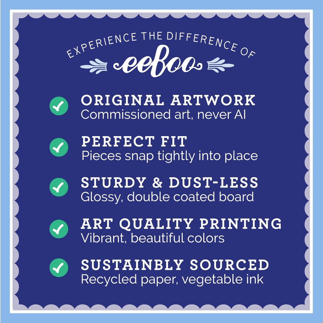 EeBoo Puzzles is een Amerikaans merk van uitstekende kwaliteit. De puzzelstukjes hebben een goede dikte, zijn stevig en hebben een perfecte pasvorm. Ze zijn afgewerkt met een glanzend laagje. De kleuren zijn heel warm en zelfs de kleinste details zijn goed zichtbaar. Wordt geleverd met een kleine poster van de puzzel.