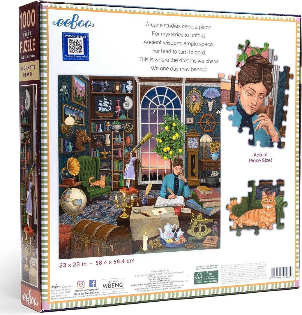 EeBoo Puzzles is een Amerikaans merk van uitstekende kwaliteit. De puzzelstukjes hebben een goede dikte, zijn stevig en hebben een perfecte pasvorm. Ze zijn afgewerkt met een glanzend laagje. De kleuren zijn heel warm en zelfs de kleinste details zijn goed zichtbaar. Wordt geleverd met een kleine poster van de puzzel.