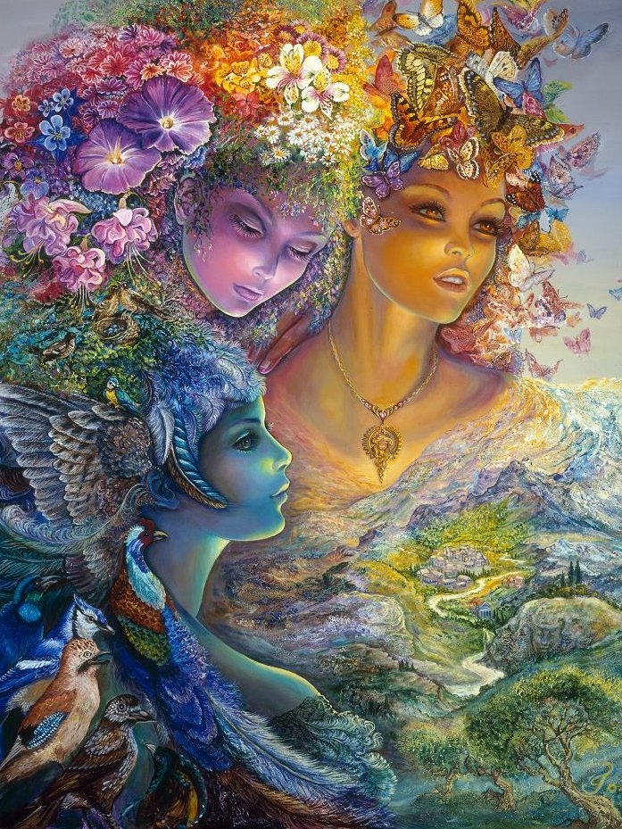 Drie onafscheidelijke zusjes - dochters van Zeus - vertegenwoordigen alles wat nobel, puur en mooi is. Ze houden een oogje in het zeil vanaf de berg Olympus. Aglaia (helderheid) is omgeven door kleurrijke vlinders. Euphrosyne (vrolijkheid) is omgeven door vrolijk fluitende vogeltjes en Thalia (bloei) is omgeven door bloeiende bloemen. Hun haren en gezichten verlichten de omgeving met een intense schoonheid.