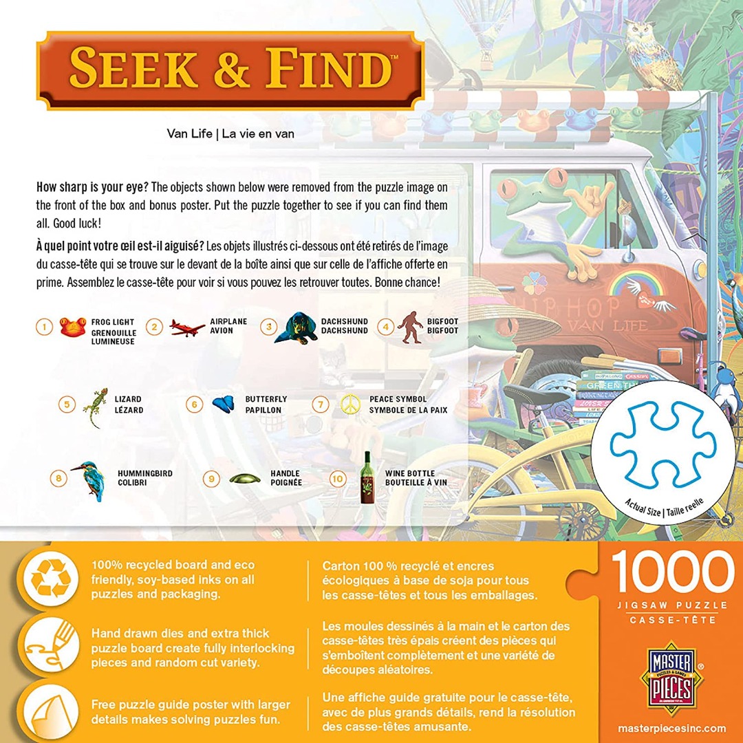 uit de serie Seek & Find. Op de afbeelding van de doos en de poster zijn 10 objecten verwijderd die wel in de puzzel te vinden zijn. Kunt u ze allemaal vinden?