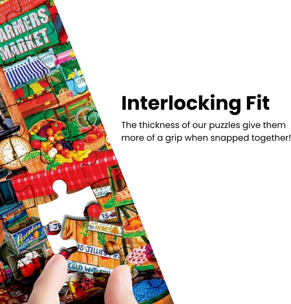 Masterpieces is een Amerikaans merk van goede kwaliteit. De puzzelstukjes zijn stevig maar zijn iets dunner dan bv. Ravensburger en Gibsons en voelen ook iets lichter aan. De kleuren zijn warm. Wordt in rastervorm gelegd met heel veel variatie in de puzzelstukjes.