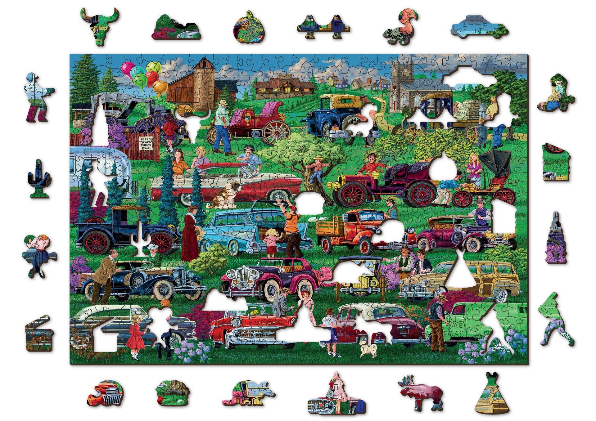 Wooden.City is een Pools merk van zeer goede kwaliteit. Zij produceren houten puzzels waarbij iedere puzzel voorzien is van een aantal speciaal gevormde puzzelstukjes o.a. vogels, vlinders en dieren. De puzzels zijn aan 2 kanten te leggen, de afbeelding zelf en de achterkant is een bloemetjespatroon in 2 kleuren. Dit geldt niet voor de vormpuzzels. De stukjes zijn 3 - 4 mm dik.