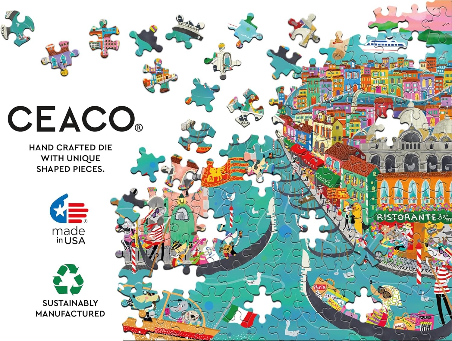 Ceaco is een Amerikaans puzzelmerk. De puzzelstukjes zijn wat dunner dan normaal en voelen ook lichter aan. Ze hebben een normale grootte. Wordt in rastervorm gelegd met heel veel variatie in de puzzelstukjes. De kleuren zijn warm.