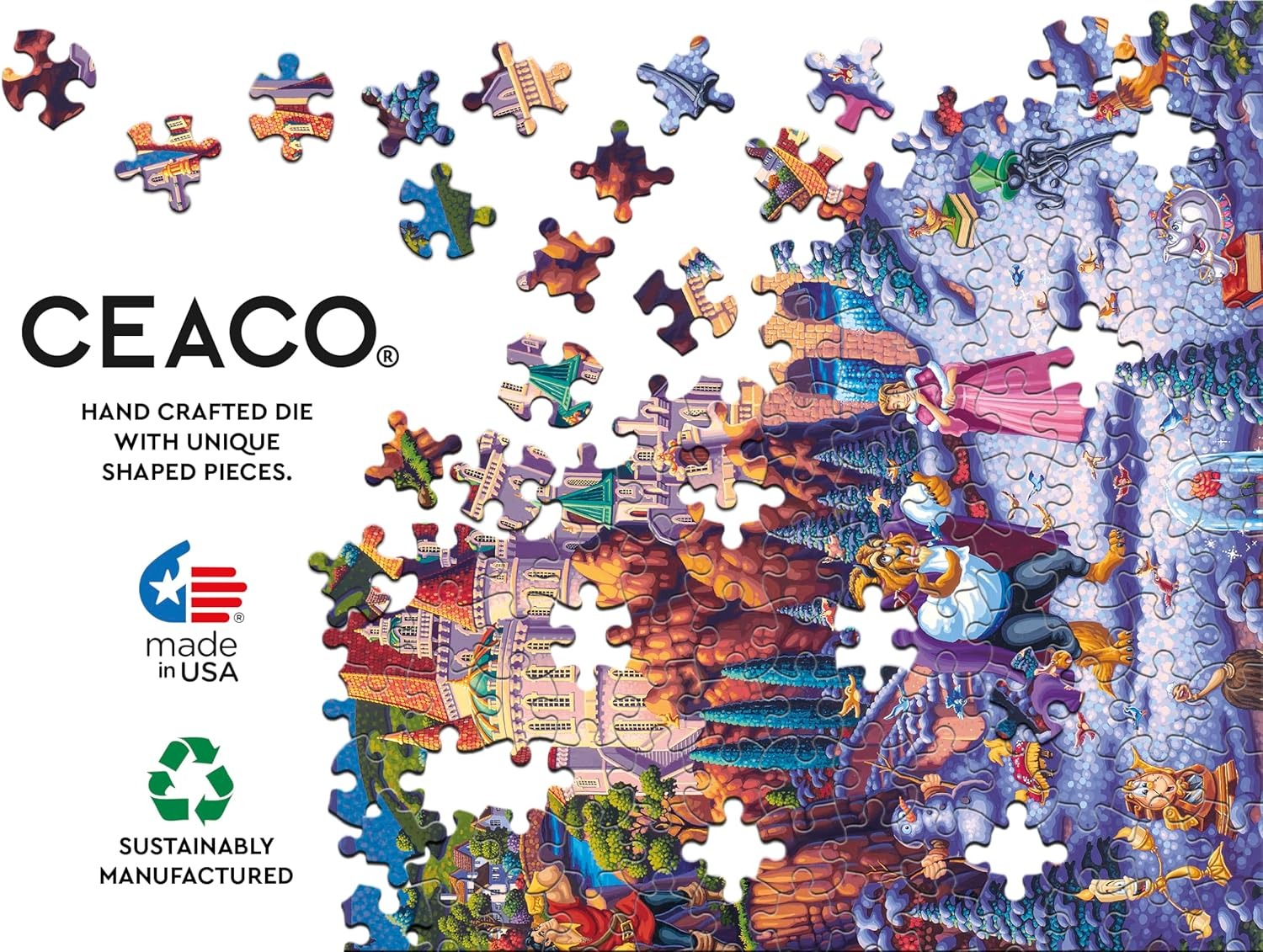 Ceaco is een Amerikaans puzzelmerk. De puzzelstukjes zijn wat dunner dan normaal en voelen ook lichter aan. Ze hebben een normale grootte. Wordt in rastervorm gelegd met heel veel variatie in de puzzelstukjes. De kleuren zijn warm.
