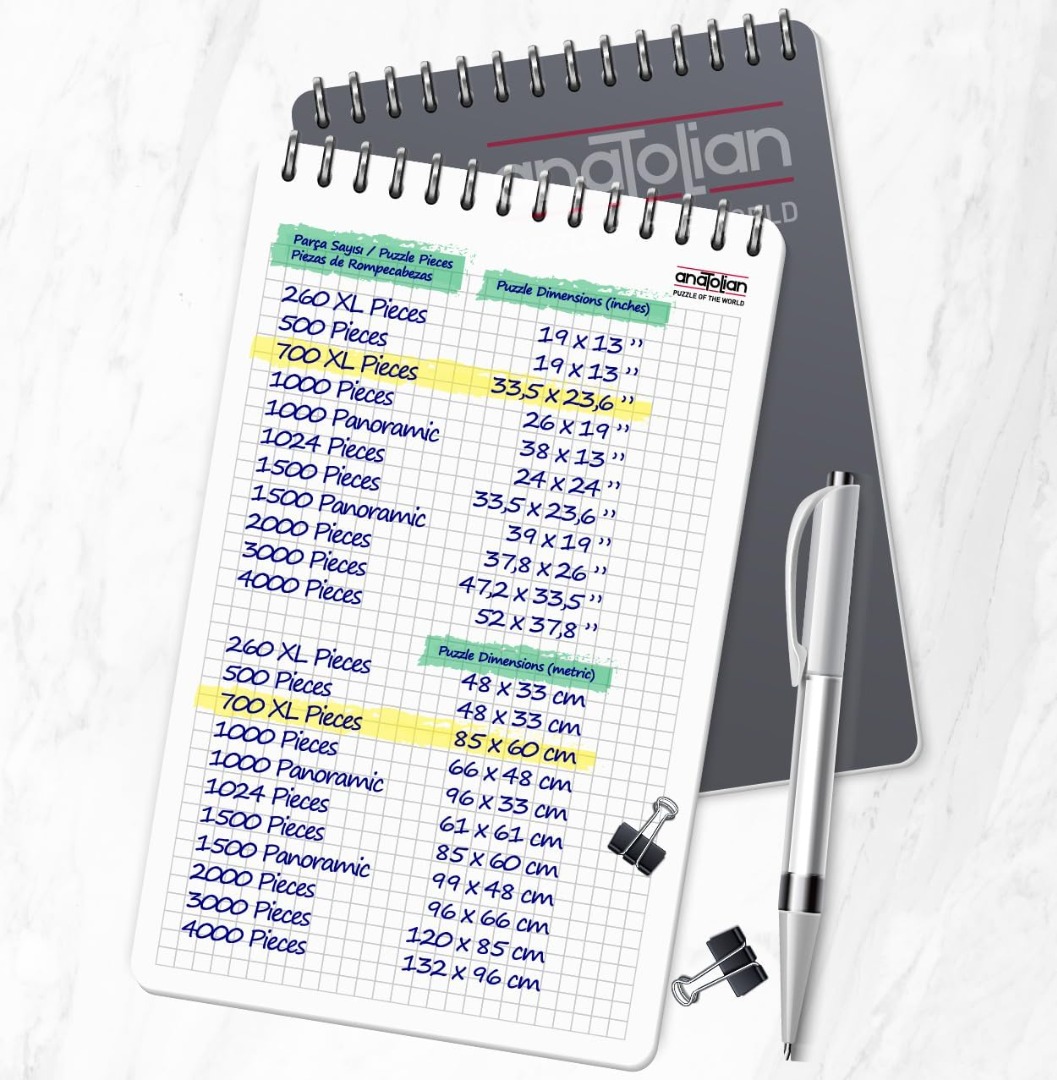 Anatolian is een Turks merk van uitstekende kwaliteit. De puzzelstukjes zijn stevig en hebben een goede dikte. De kleuren zijn warm en de afbeeldingen scherp. De puzzel wordt in rastervorm gelegd (net zoals Gibsons en Ravensburger) maar de puzzelstukjes zelf hebben zoveel variëteit dat het altijd duidelijk is of een stukje past of niet. Wordt geleverd met een standaard om de deksel in te zetten.