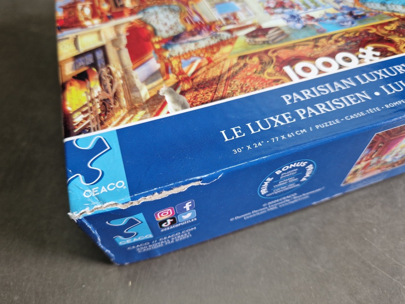 DE DOOS IS HEEFT VERSCHILLENDE SCHADES IN DE HOEKJES. ZIE HIERVOOR DE FOTO'S. DAAROM KOST DEZE PUZZEL GEEN 27,95 EURO MAAR 22,95 EURO.