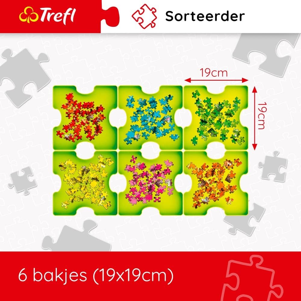 Sorteer de puzzelstukjes op kleur of vorm in de 6 handige sorteer bakjes, zo kan er geen puzzelstukje meer kwijtraken.