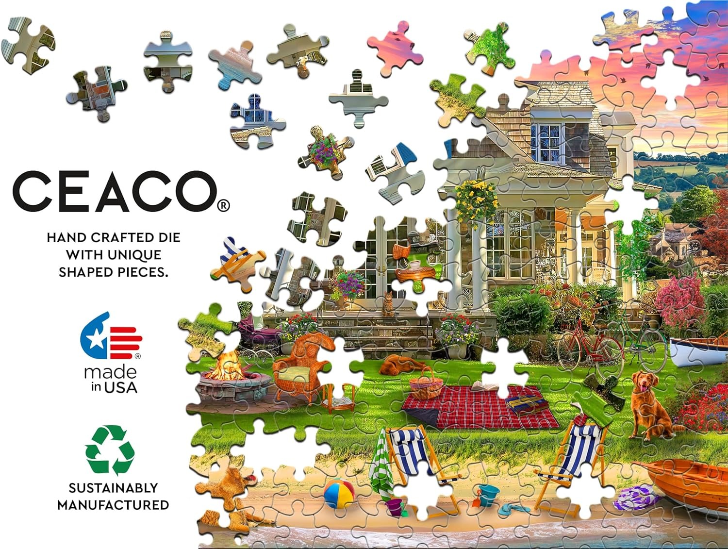 Ceaco is een Amerikaans puzzelmerk. De puzzelstukjes zijn wat dunner dan normaal en voelen ook lichter aan. Ze hebben een normale grootte. Wordt in rastervorm gelegd met heel veel variatie in de puzzelstukjes. De kleuren zijn warm.