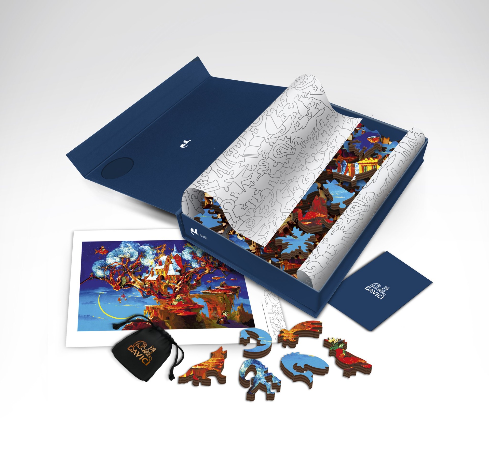 Davici is een zeer exclusief Amerikaans puzzelmerk met houten puzzelstukjes. In plaats van de gebruikelijke details hebben deze puzzelstukjes de figuren van vogels en dieren, draken en vreemde vissen, koningen en zwervers, sterren en planeten, huizen en steden. Honderden helden van sprookjes en surrealistische verhalen. Er wordt gebruik gemaakt van natuurlijk papier, berkenhout en een onschadelijkeniet-giftige lijm.