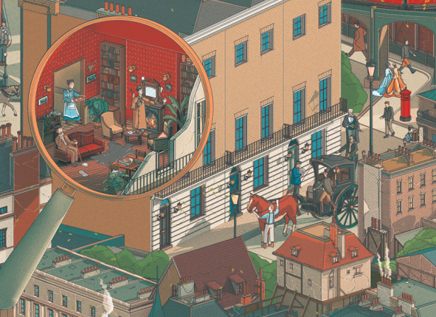 Betreed London in de tijd van Sherlock Holmes, compleet met bootachtervolgingen en natuurlijk 221B Baker Street. Zoek naar Conan-Doyle's meest bekende karakters van the Hound of Baskerville Hall, Moriarty, Dr. Watson en Mycroft. Op de bijgevoegde poster kunt u alle bekende personen en plaatsen vinden die een rol gespeeld hebben in de avonturen van deze bekende detective.
