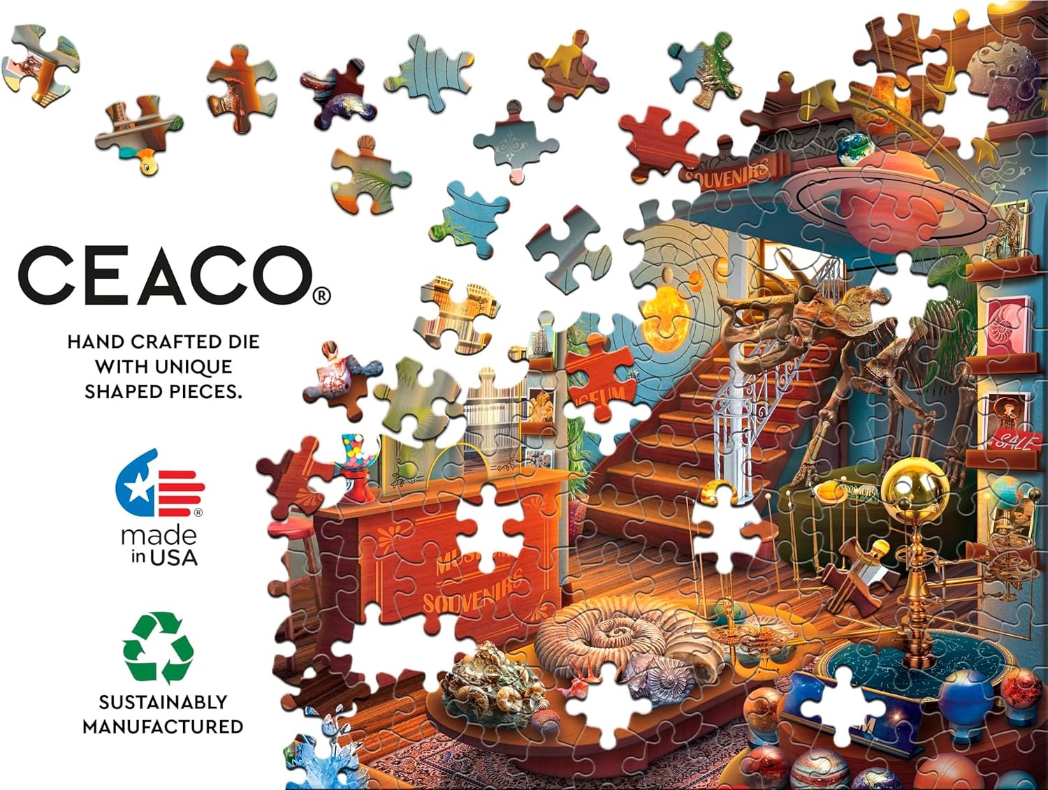Ceaco is een Amerikaans puzzelmerk. De puzzelstukjes zijn wat dunner dan normaal en voelen ook lichter aan. Ze hebben een normale grootte. Wordt in rastervorm gelegd met heel veel variatie in de puzzelstukjes. De kleuren zijn warm.